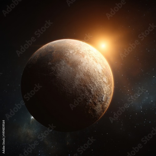 Wall mural : Dramatic planet in deep space with a distant sun casting a warm glow on its textured surface
