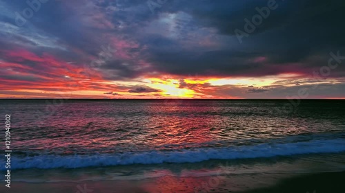 The watermark will not be included on Wall mural.: Dramatic red sunset and sea beach in dusk, tracking shot 4k