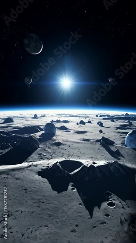 Wall mural : Dramatic space landscape with craters and celestial objects in the distance, bathed in bright cosmic