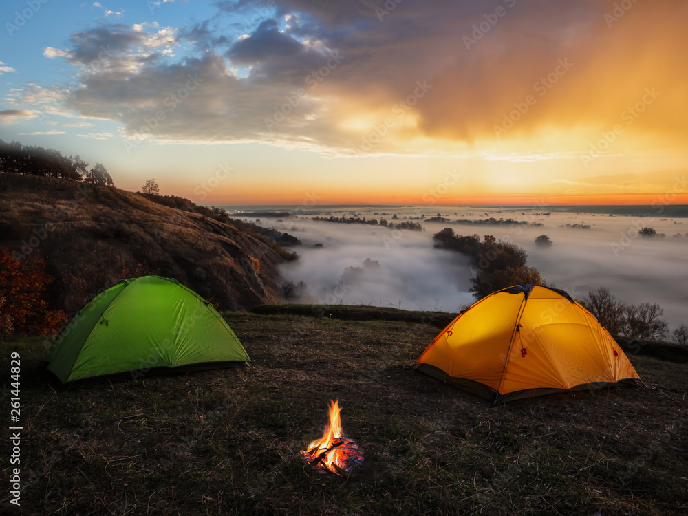 The watermark will not be included on Wall mural.: Dramatic sunset over the river and tents with a fire