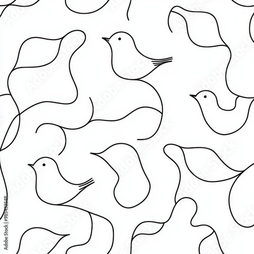 The watermark will not be included on Wall mural.: Drawing of abstract birds in a continuous one line pattern