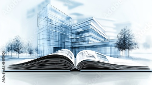 The watermark will not be included on Wall mural.: Drawing of an open book showing photos of modern architecture