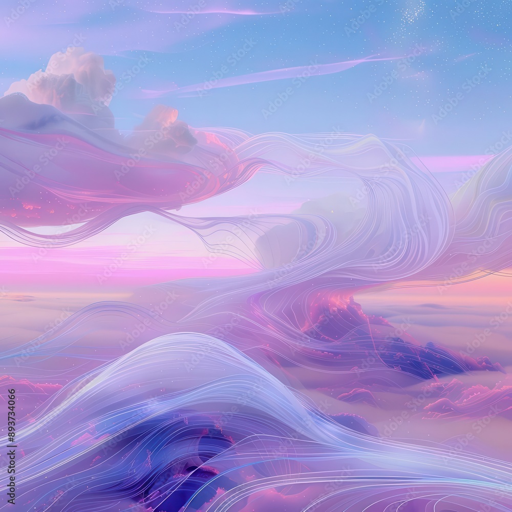The watermark will not be included on Wall mural.: Dreamlike abstract landscape with swirling pastel gradients and ethereal glitch effects