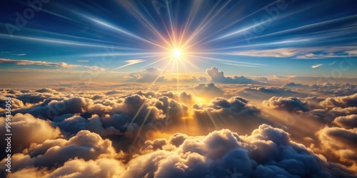 Wall mural dreamy image of flying above fluffy clouds with rays of light shining through, creating a magical at - Wall murals Wall mural dreamy image of flying above fluffy clouds with rays of light shining through, creating a magical at - Wall murals