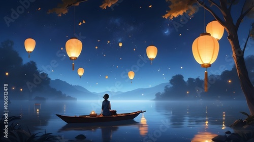 The watermark will not be included on Wall mural.: Dreamy landscape with floating lanterns