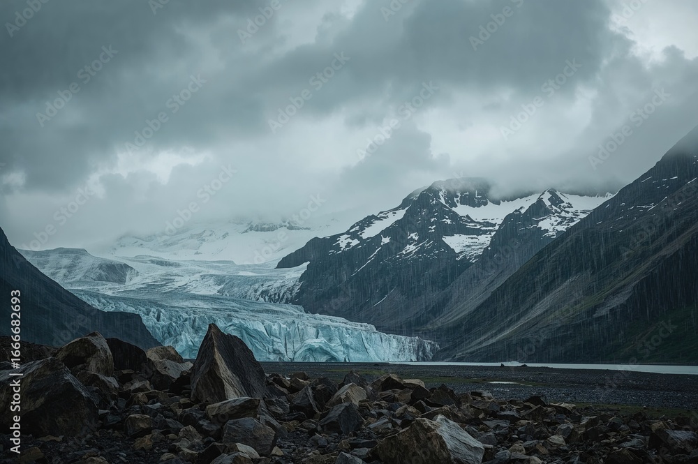 Wall mural dreary weather with rugged cliffs and a towering snowy summit under persistent drizzle
