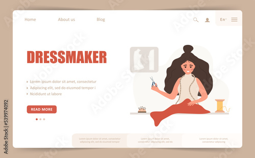 Wall mural dressmaker landing page or web banner template. woman seamstress with scissors cuts red fabric. fash - Wall murals Wall mural dressmaker landing page or web banner template. woman seamstress with scissors cuts red fabric. fash - Wall murals