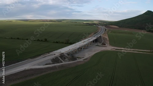 Wall mural drone flight over beautiful nature with green rolling fields and a newly built highway that passes t