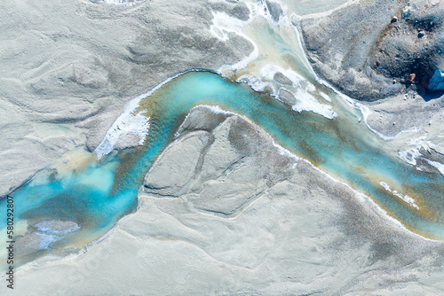 Wall mural : Drone view of the azure river in the glacier valley - view of the moraines - landscape from the air - r