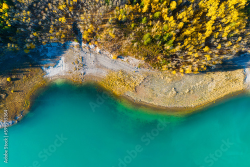 The watermark will not be included on Wall mural.: Drone view of the lake and forest in the glacier valley - view of the moraines - landscape from the ai