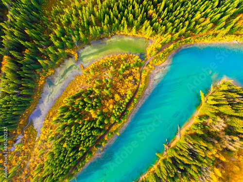 Wall mural drone view of the river in the forest. an aerial view of an woods. winding river among the trees. tu - Wall murals Wall mural drone view of the river in the forest. an aerial view of an woods. winding river among the trees. tu - Wall murals
