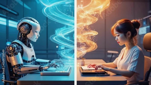 Wall mural dual realities: a visual exploration of technology's duality, featuring a detailed depiction of a hu - Wall murals Wall mural dual realities: a visual exploration of technology's duality, featuring a detailed depiction of a hu - Wall murals