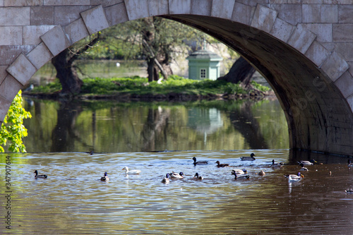 The watermark will not be included on Wall mural.: Ducks in a lake in a park under a bridge - -