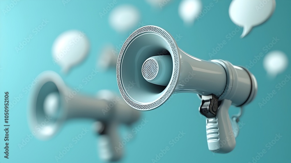 Wall mural : Dynamic 3d megaphone design with floating speech bubbles set against a modern blue background symbol