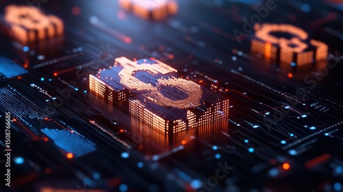 Wall mural dynamic abstract background with dollar signs made of pixels and glowing circuitry