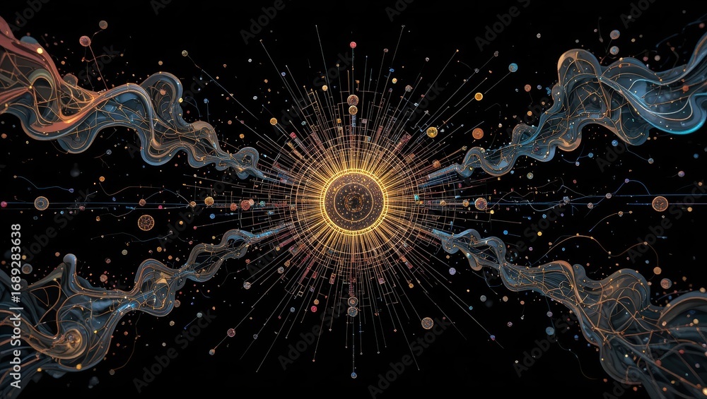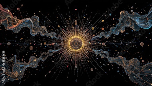 Wall mural : Dynamic abstract energy explosion with colorful particles and waves in a cosmic space