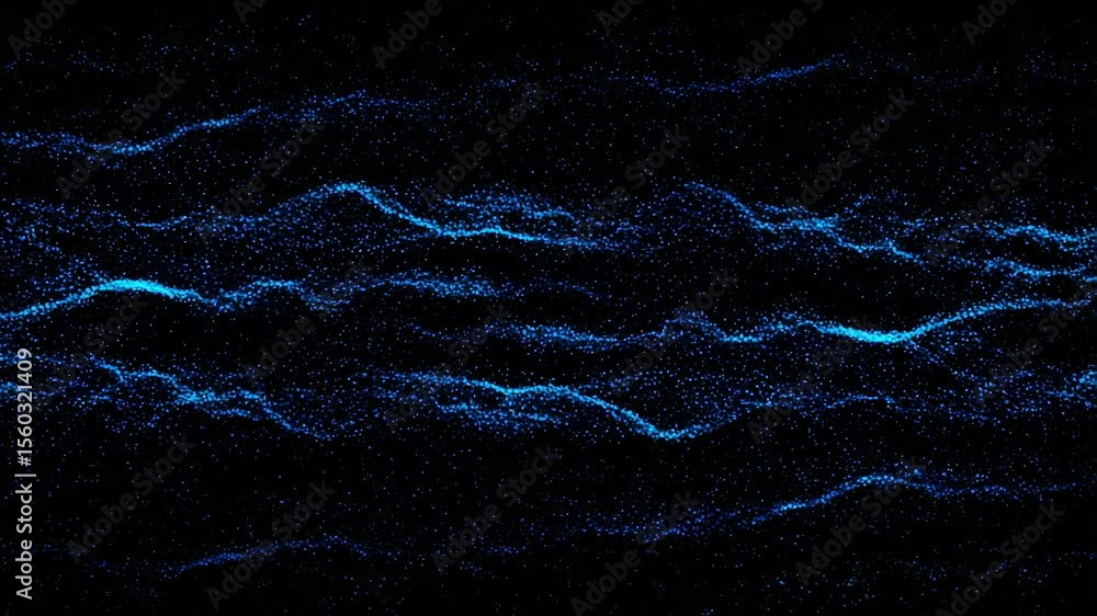 Wall mural dynamic blue wavy lines with sparkling dots on black background for modern futuristic design and tec