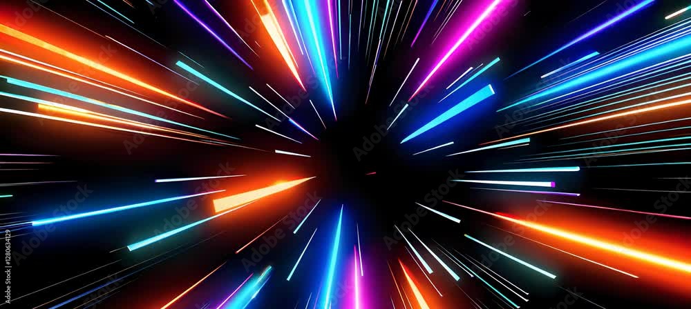 Wall mural : Dynamic burst of colorful light trails in motion on a dark background