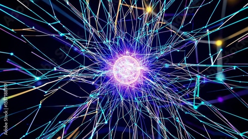 Wall mural : Dynamic burst of vibrant energy with intersecting neon lines radiating from a central glowing core,