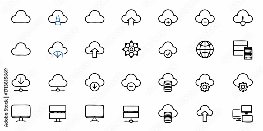 Wall mural : Dynamic cloud computing icons representing data storage, network, and digital services for modern te