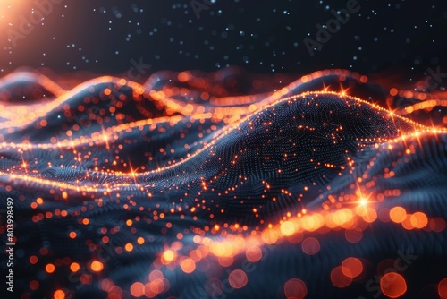 The watermark will not be included on Wall mural.: Dynamic digital artwork portraying red glowing particle waves on a dark background, signifying data