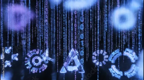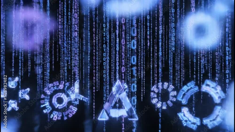 Wall mural dynamic digital rain of blue binary code streams through abstract glowing futuristic shapes in this  - Wall murals Wall mural dynamic digital rain of blue binary code streams through abstract glowing futuristic shapes in this - Wall murals