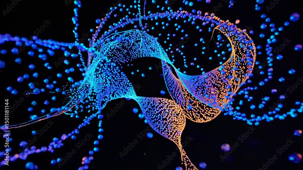 Wall mural : Dynamic display of swirling blue and orange particles forming a wave-like pattern against a dark bac