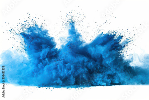 Wall mural : Dynamic explosion of vibrant blue powder cloud against white backdrop creating a stunning visual dis