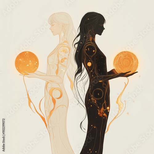 Wall mural dynamic gemini depiction with twin characters back-to-back, each holding a glowing orb, one light an - Wall murals Wall mural dynamic gemini depiction with twin characters back-to-back, each holding a glowing orb, one light an - Wall murals