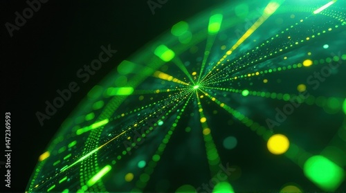 The watermark will not be included on Wall mural.: Dynamic green digital sphere with glowing lines and dots on dark background -
