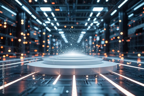 Wall mural : Dynamic light flow: three-dimensional white foundation with glowing particles and cyber technology b