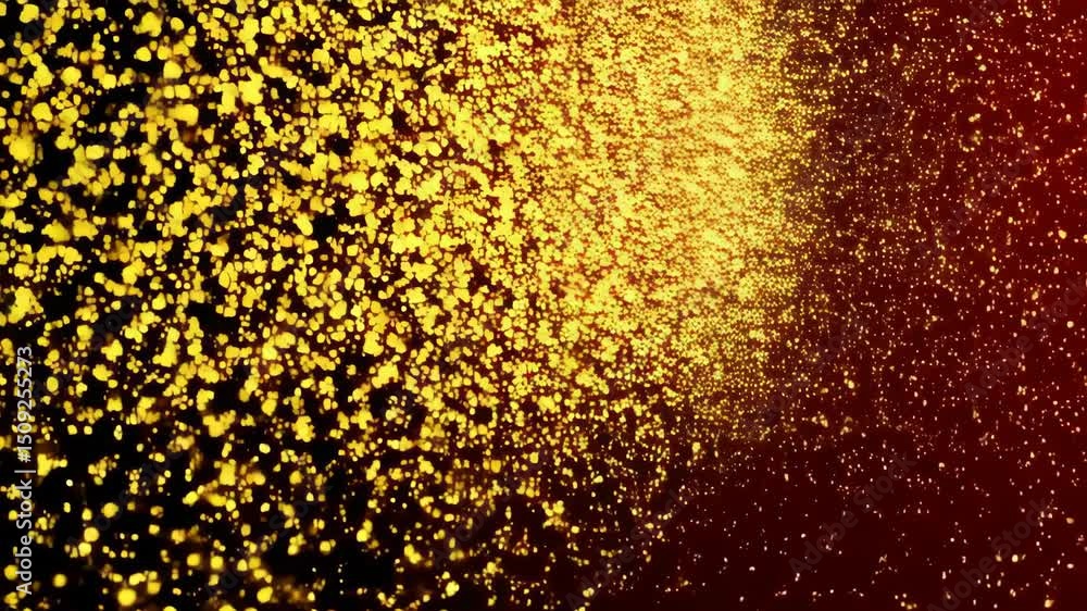 Wall mural : Dynamic shimmering golden particles suspended in a flowing stream on a rich red gradient background