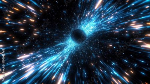 Wall mural dynamic visual of a glowing black hole with blue and white light rays streaming around it, evoking m - Wall murals Wall mural dynamic visual of a glowing black hole with blue and white light rays streaming around it, evoking m - Wall murals