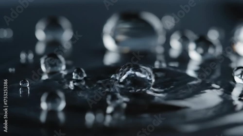 The watermark will not be included on Wall mural.: Dynamic water droplets flow and merge across a smooth, reflective surface in ultra slow motion merge