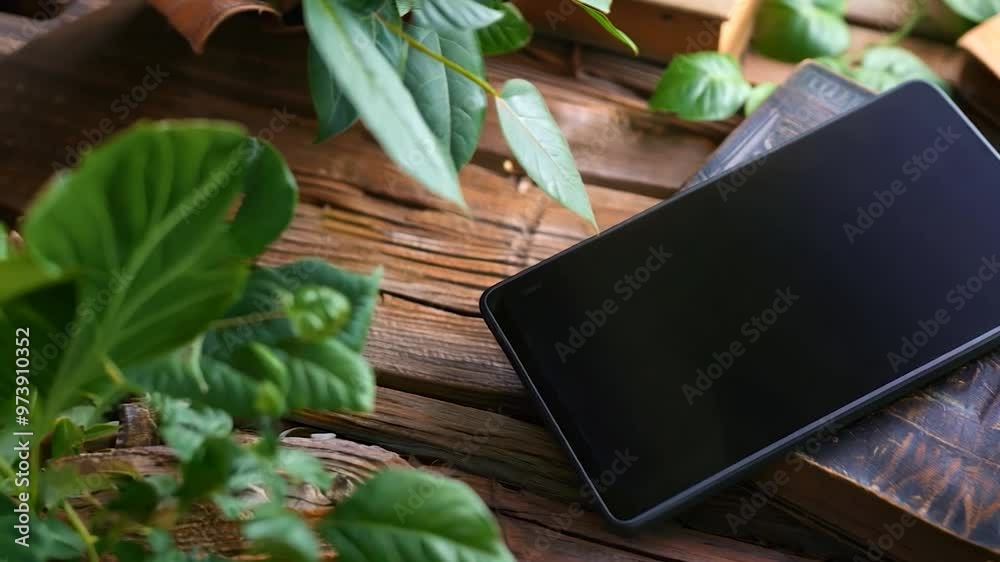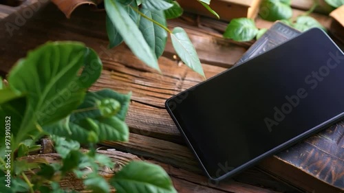 The watermark will not be included on Wall mural.: E-reader displaying an educational book on a rustic wooden table