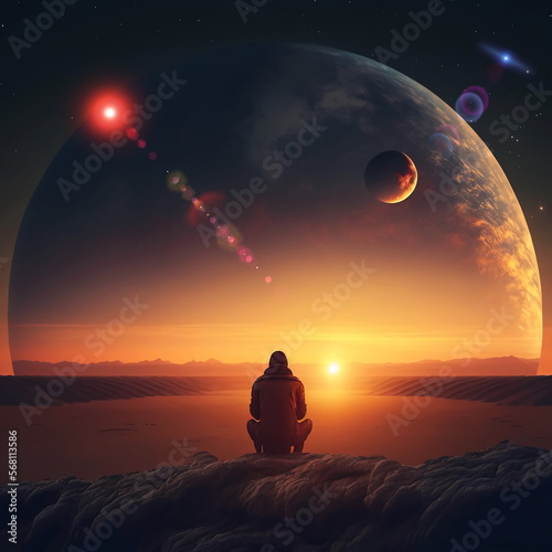 Wall mural earth and moon on sunset , night alien planet space starry sky flares cosmic fantastic background ge - Wall murals Wall mural earth and moon on sunset , night alien planet space starry sky flares cosmic fantastic background ge - Wall murals
