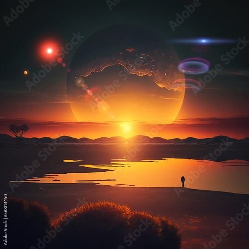 Wall mural earth and moon on sunset , night alien planet space starry sky flares cosmic fantastic background ge - Wall murals Wall mural earth and moon on sunset , night alien planet space starry sky flares cosmic fantastic background ge - Wall murals