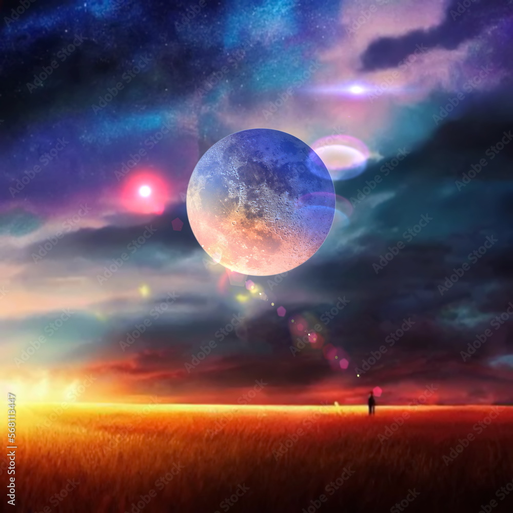 Wall mural earth and moon on sunset , night alien planet space starry sky flares cosmic fantastic background ge - Wall murals Wall mural earth and moon on sunset , night alien planet space starry sky flares cosmic fantastic background ge - Wall murals