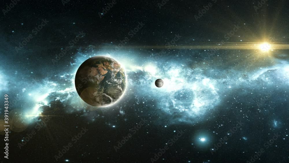 Wall mural : Earth and moon on the background of a beautiful nebula, 3d animation