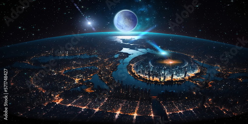 The watermark will not be included on Wall mural.: Earth and night city light map starry sky and moon view from space surrealism concept ,generated ai