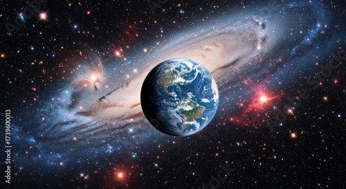 Wall mural : Earth floats in front of a distant galaxy, surrounded by nebulas and stars