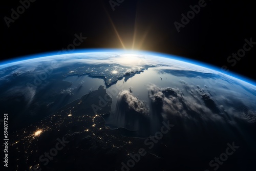 Wall mural earth from space with blue sunrise and stars in the background. generative ai