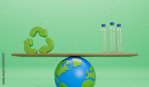 Wall mural earth globe with empty plastic bottles and recycle symbol. global plastic pollution concept. 3d rend