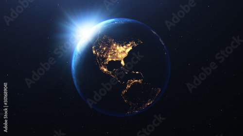 Wall mural : Earth planet with the sun viewed from space , 3d render of planet earth, elements of this image prov