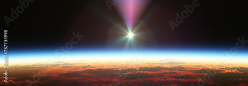 Wall mural earth sunrise from space over cloudy ocean. 3d rendering