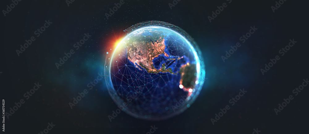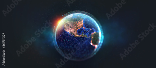 Wall mural earth view from space. global network. blockchain technology. planet and communication. future world - Wall murals Wall mural earth view from space. global network. blockchain technology. planet and communication. future world - Wall murals