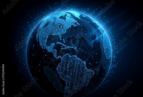 Wall mural earth with glowing blue circuit lines connecting various points across its surface, symbolizing glob