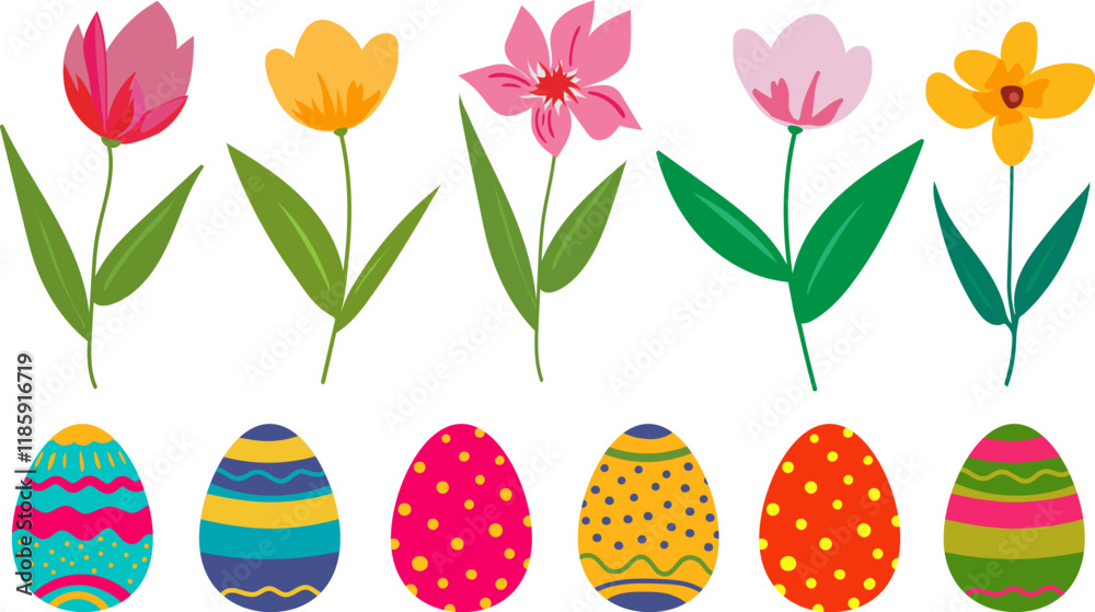 The watermark will not be included on Wall mural.: Easter vector objects - eggs and spring flowers - tulips and daffodils