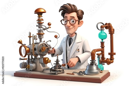The watermark will not be included on Wall mural.: Eccentric inventor with a lab coat and quirky gadgets, working on a strange contraption in 3d style
