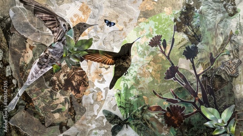 The watermark will not be included on Wall mural.: Eco friendly collage recycled materials, green tones, nature, wildlife imagery, ai generated